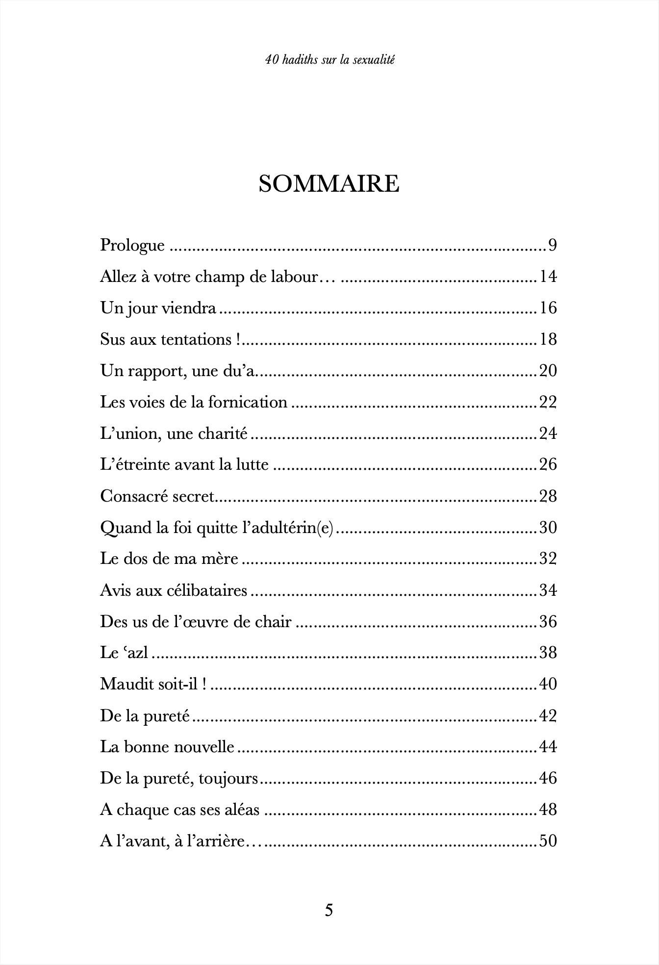 Dans la tradition prophétique, la sexualité n’est ni un tabou ni un sujet laissé à l’instinct. Elle est au contraire un domaine noble, encadré par la sagesse, purifié par la foi, et orienté vers le bien-être du couple et la préservation de la société. À travers ce recueil de quarante aḥadīth authentiques, le lecteur découvrira :